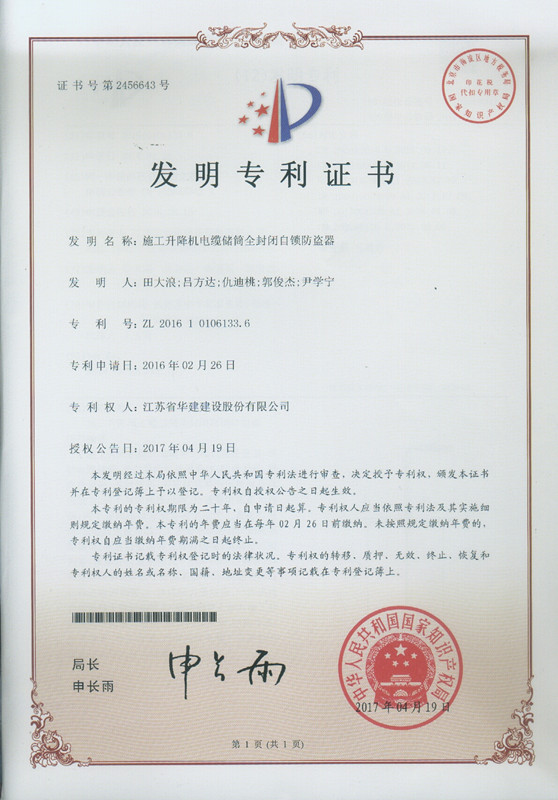 我公司又獲得一項國家發明專利授權 時間:2017-06-02 4203 日前,公司又一項發明專利獲得國家知識產權局授權,此項專利名稱為“施工升降機電纜儲筒全封閉自鎖防盜器”,專利號為ZL 2016 1 0106133.6。 至此,公司已有22項發明專利入賬。