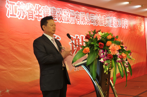 11月4日,公司在惠州隆重舉辦參加惠州建設(shè)20周年答謝酒會(huì),副董事長、總經(jīng)理宗有農(nóng)主持并作開場致辭。惠州市有關(guān)政府部門、部分合作方企業(yè)的負(fù)責(zé)人,華建聯(lián)盟成員單位負(fù)責(zé)人,公司董事、監(jiān)事和高管等130余人出席酒會(huì)。惠州公司總經(jīng)理華恒榮介紹了公司參加惠州建設(shè)二十年的有關(guān)情況。惠州市工商聯(lián)主席、恒宇實(shí)業(yè)發(fā)展公司董事長楊滿芳代表合作方發(fā)言,惠州市住房和城鄉(xiāng)規(guī)劃建設(shè)局副局長陳訓(xùn)政代表政府主管部門致辭,分別對江蘇華建進(jìn)惠施工二十周年表示祝賀。公司董事長陸金龍代表總部對惠州市有關(guān)政府部門、相關(guān)合作方和社會(huì)各界人士給予公司的關(guān)心和支持表示誠摯的感謝,并表達(dá)了進(jìn)一步加大支持力度、加強(qiáng)戰(zhàn)略合作、加快科學(xué)發(fā)展的意愿。