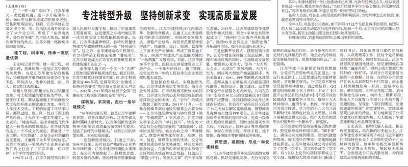 王宏董事長接受《建筑時報》專訪:專注轉型升級,堅持創新求變,實現高質量發展 時間:2018-09-11 4216 9月10日,《建筑時報》頭版及微信公眾號對王宏董事長的專訪給予了刊載。 王宏董事長在專訪中就江蘇華建成立36年來,是如何在改革開放的時代大背景下,走出一條具有華建特色的高質量發展之路,跨入新時代,江蘇華建又是如何以改革創新的進取精神不斷轉型升級,契合高質量發展的時代要求,創造出獨特的華建模式進行了詳細介紹。