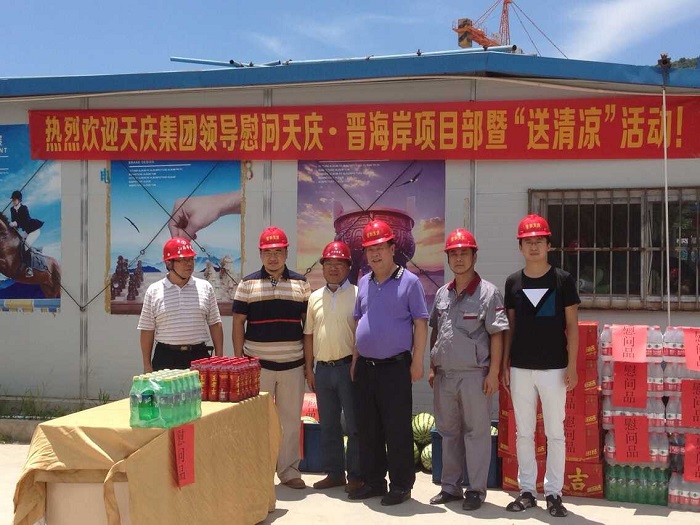 千里送清涼——天慶集團董事長韓慶慰問我司一線職工 時間:2015-08-05 4324 8月4日中午,烈日當空,驕陽似火。甘肅天慶房地產集團有限公司董事長韓慶一行不遠千里來到廣東珠海,頂著烈日,冒著酷暑,在項目負責人陳建的陪同下,慰問我司承建的“天慶·晉海岸”項目一線施工人員,給工人們送來了西瓜、礦泉水、王老吉等飲品和深情問候,讓廣大一線職工在炎炎烈日下感受到陣陣清涼。