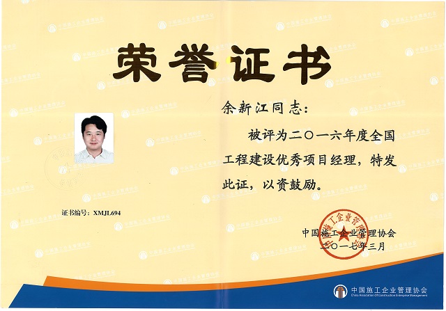 余新江榮獲“2016年度全國工程建設優秀項目經理” 時間:2017-04-24 3557 4月20日 ,中國施工企業管理協會第32次年會在廈門召開。會上,中施企協對全國優秀項目經理進行了表彰,珠海分公司余新江同志被授予“2016年度全國工程建設優秀項目經理”稱號。