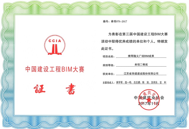 12月20日,由中國建筑業協會主辦的第三屆中國建設工程BIM大賽結果正式公布,江蘇華建珠海公司申報的《橫琴隆義廣場BIM成果》獲得單項組二等獎。
