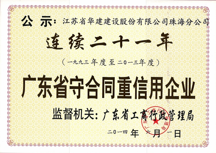 2014廣東省連續(xù)二十一年守合同重信用企業(yè)