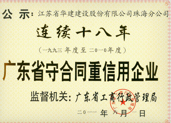 2011年廣東省連續十八年守合同重信用企業