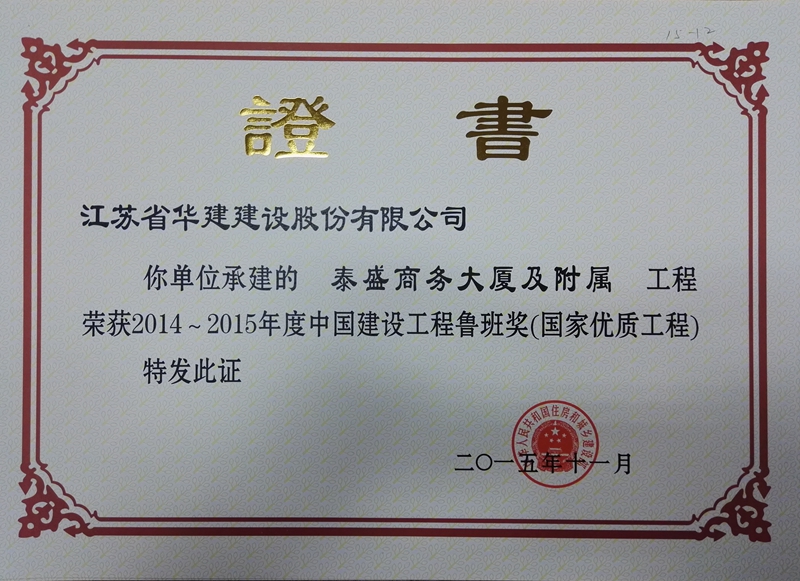 秦皇島泰盛商務大廈 時間:2015-11-23 17852 泰盛商務大廈及附屬工程地處秦皇島市經濟開發區核心位置,集商務辦公、會議中心、一站式服務大廳及報告演藝廳等功能為一體的綜合類商務辦公樓,地下1層,地上23層,裙樓兩層,建筑面積90148㎡,建筑高度97.75米。工程先后榮獲全國建筑業綠色施工示范工程、江蘇省新技術應用示范工程、江蘇省省級工法、河北省結構優質工程獎、河北省建設工程安濟杯獎(省優)、全國優秀項目管理成果獎、全國優秀QC小組成果一等獎。2015年,被中建協評為2014-2015年度中國建設工程魯班獎(國家優質工程)。