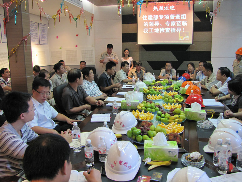 9月18日上午,國家住房城鄉(xiāng)建設(shè)部建筑施工安全專項(xiàng)督查組蒞臨我公司廣西麗原·天際城工地檢查指導(dǎo)工作,勘察了施工現(xiàn)場(chǎng)的實(shí)體安全狀況,查閱了施工質(zhì)量安全技術(shù)資料,檢查了我公司的資質(zhì)、安全許可、三類人員與特種作業(yè)人員持證的情況。項(xiàng)目部的安全防護(hù)與文明施工工作受到了督查組的一致好評(píng),住建部工程質(zhì)量安全監(jiān)管司王樹平副司長在知道我們爭創(chuàng)“魯班獎(jiǎng)”的情況后,提出了許多寶貴的意見,并預(yù)祝我們的質(zhì)量目標(biāo)得以圓滿實(shí)現(xiàn)。
